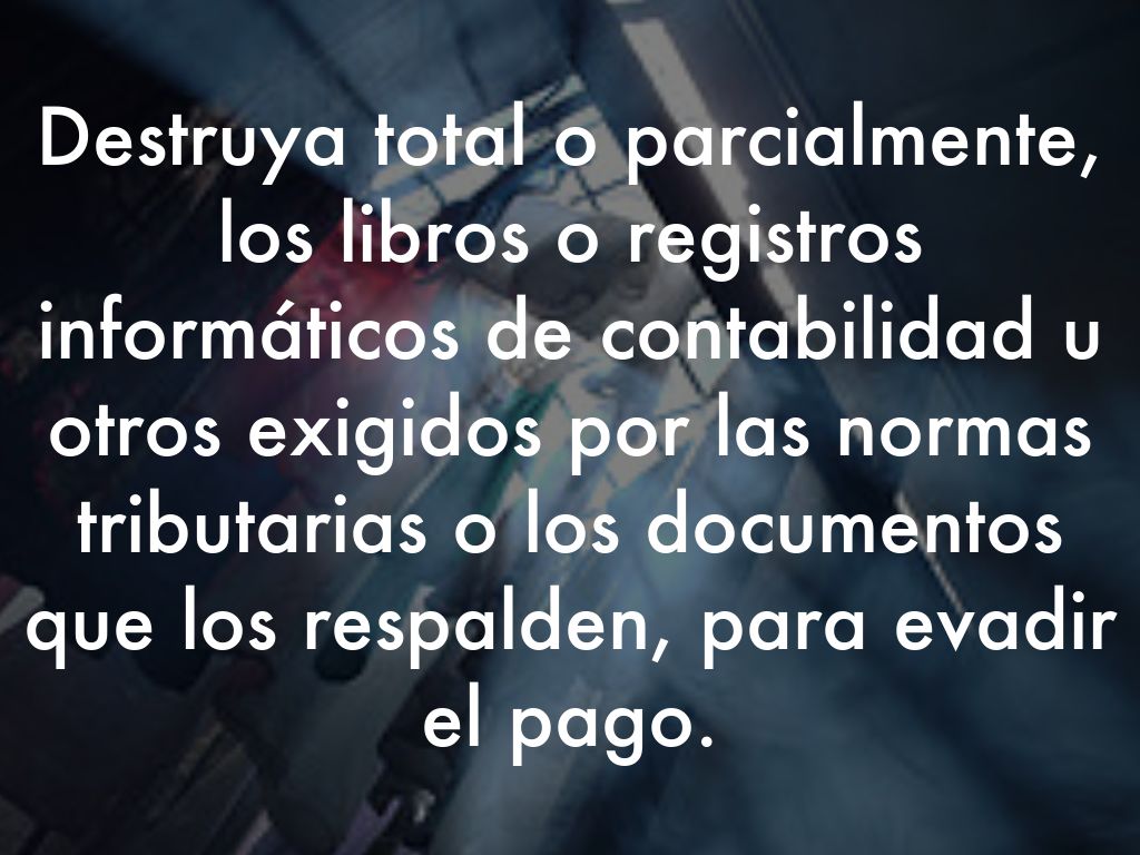 Destruya total o parcialmente, los libros o registros informáticos de contabilidad u otros exigidos por las normas tributarias o los documentos que los respalden, para evadir el pago.