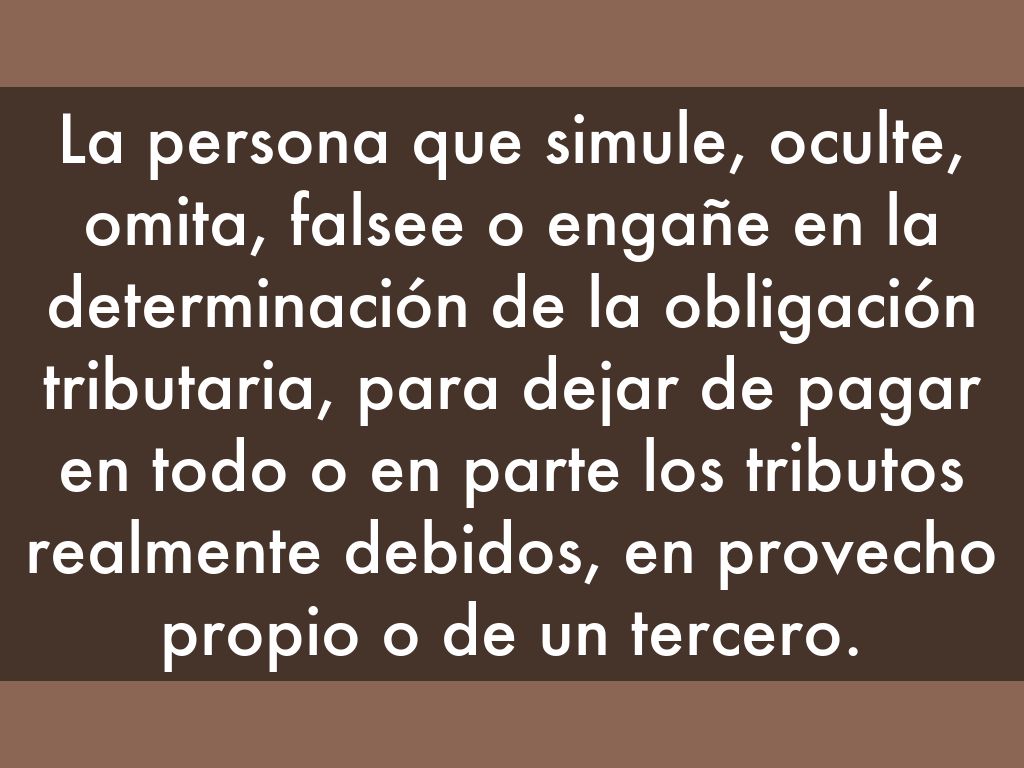 La persona que simule, oculte, omita, falsee o engañe en la determinación de la obligación tributaria, para dejar de pagar en todo o en parte los tributos realmente debidos, en provecho propio o de un tercero.
