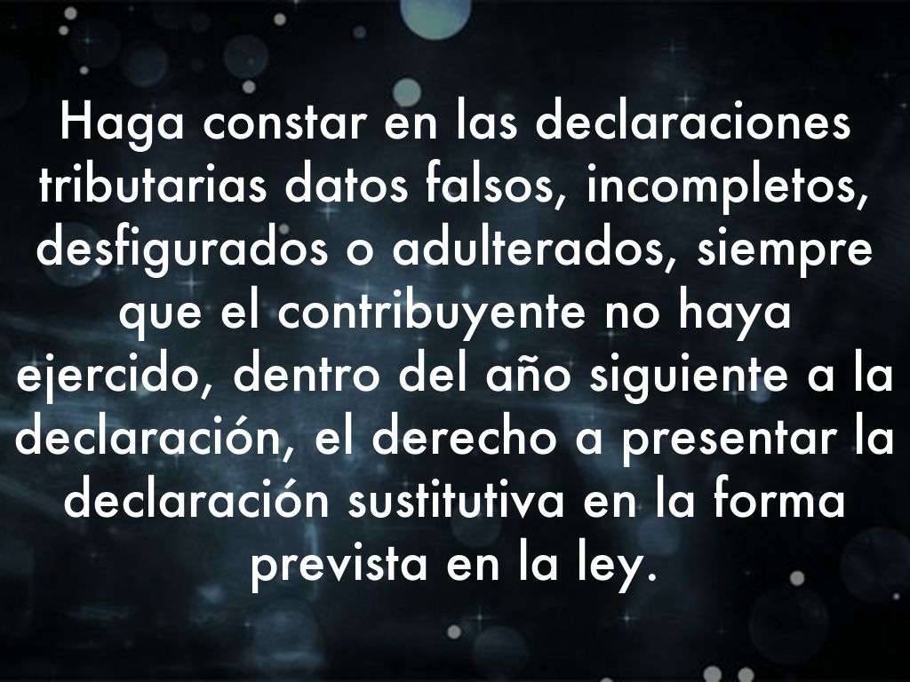 Haga constar en las declaraciones tributarias datos falsos, incompletos, desfigurados o adulterados, siempre que el contribuyente no haya ejercido, dentro del año siguiente a la declaración, el derecho a presentar la declaración sustitutiva en la forma prevista en la ley.