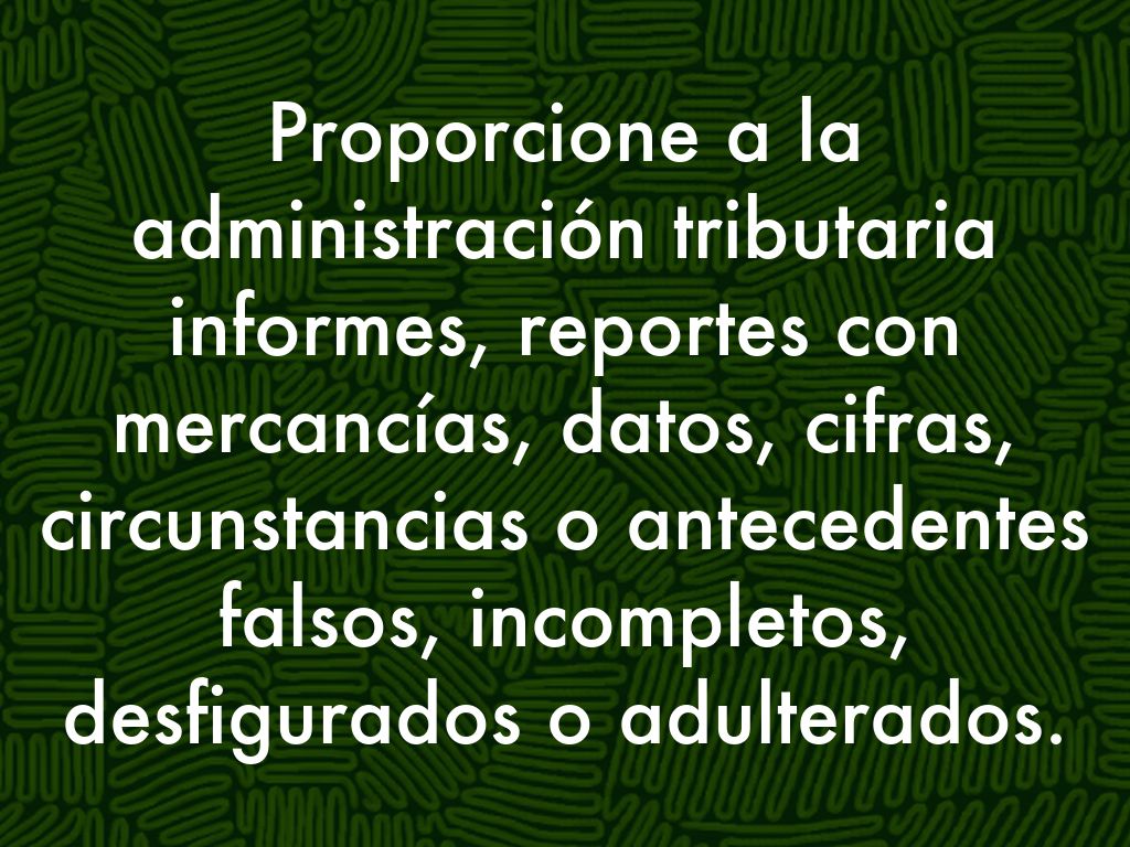 Proporcione a la administración tributaria informes, reportes con mercancías, datos, cifras, circunstancias o antecedentes falsos, incompletos, desfigurados o adulterados.