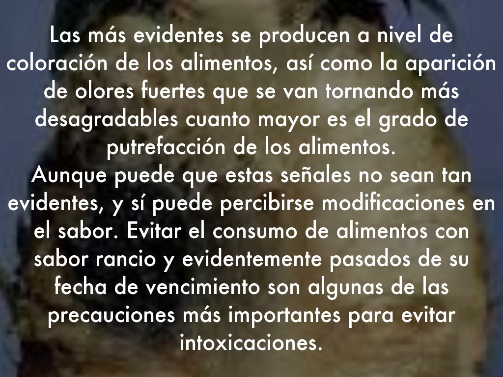 Aunque puede que estas señales no sean tan evidentes, y sí puede percibirse modificaciones en el sabor. Evitar el consumo de alimentos con sabor rancio y evidentemente pasados de su fecha de vencimiento son algunas de las precauciones más importantes para evitar intoxicaciones.