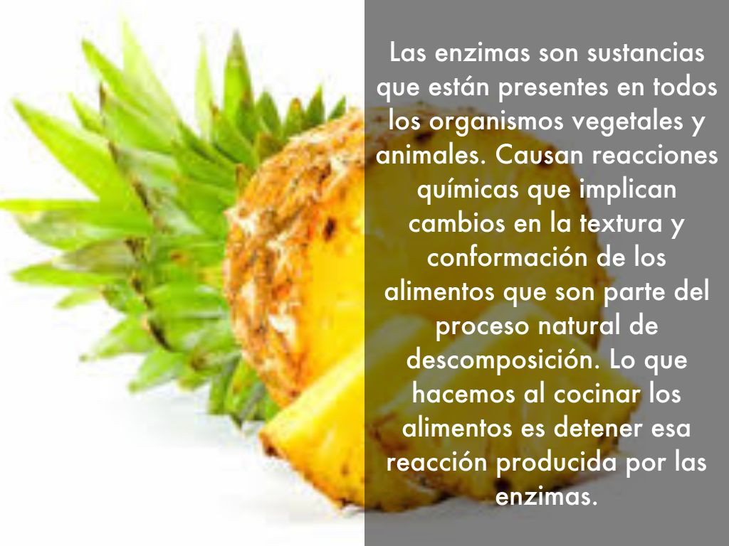 Las enzimas son sustancias que están presentes en todos los organismos vegetales y animales. Causan reacciones químicas que implican cambios en la textura y conformación de los alimentos que son parte del proceso natural de descomposición. Lo que hacemos al cocinar los alimentos es detener esa reacción producida por las enzimas.