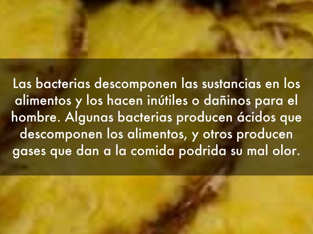 Las bacterias descomponen las sustancias en los alimentos y los hacen inútiles o dañinos para el hombre. Algunas bacterias producen ácidos que descomponen los alimentos, y otros producen gases que dan a la comida podrida su mal olor.
