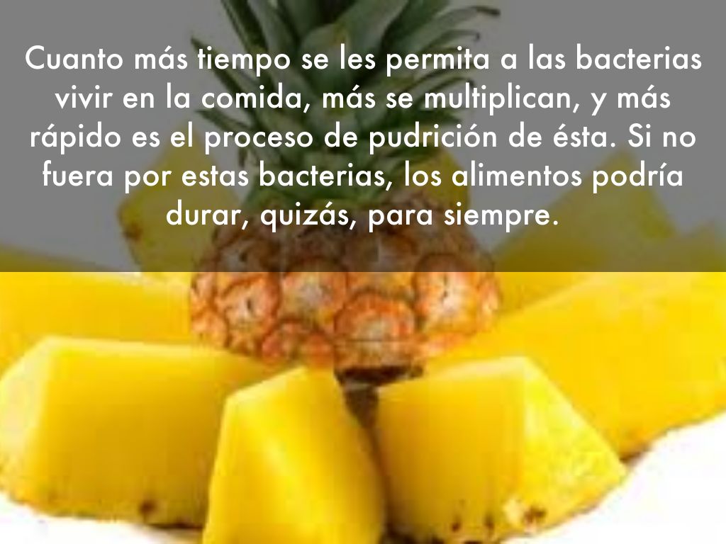 Cuanto más tiempo se les permita a las bacterias vivir en la comida, más se multiplican, y más rápido es el proceso de pudrición de ésta. Si no fuera por estas bacterias, los alimentos podría durar, quizás, para siempre.