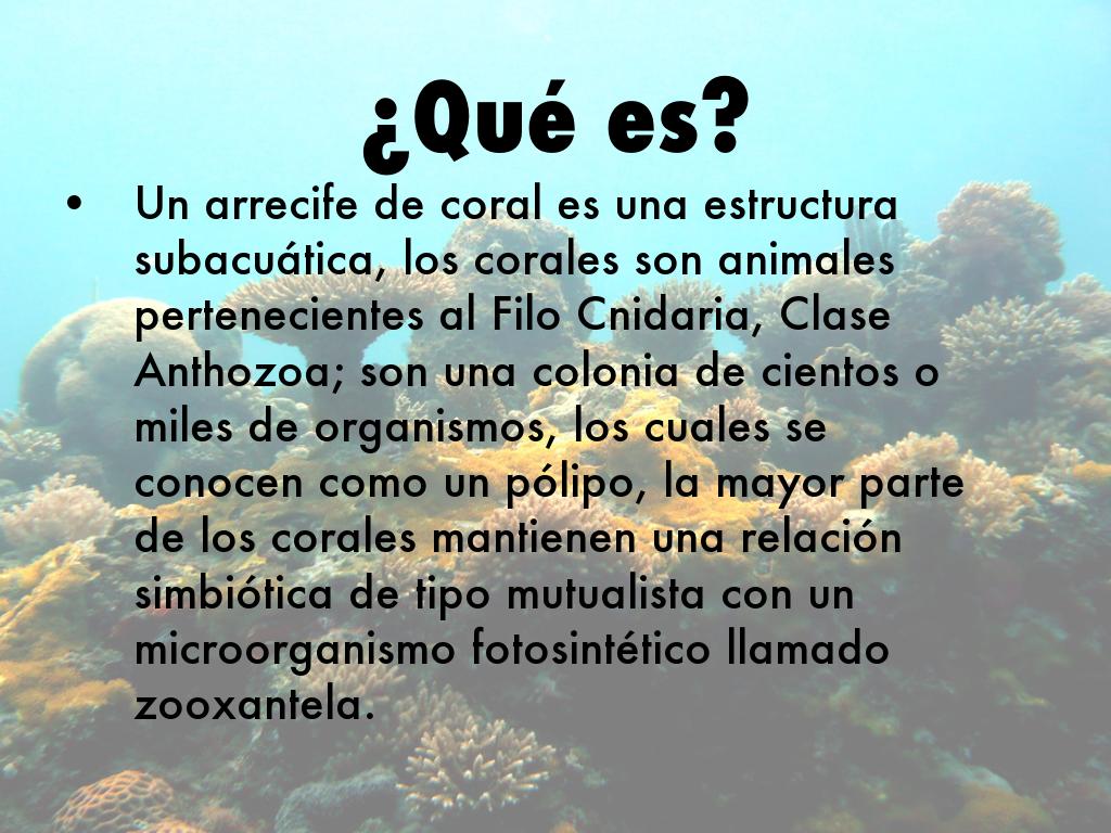 Un arrecife de coral es una estructura subacuática, los corales son animales pertenecientes al Filo Cnidaria, Clase Anthozoa; son una colonia de cientos o miles de organismos, los cuales se conocen como un pólipo, la mayor parte de los corales mantienen una relación simbiótica de tipo mutualista con un microorganismo fotosintético llamado zooxantela.