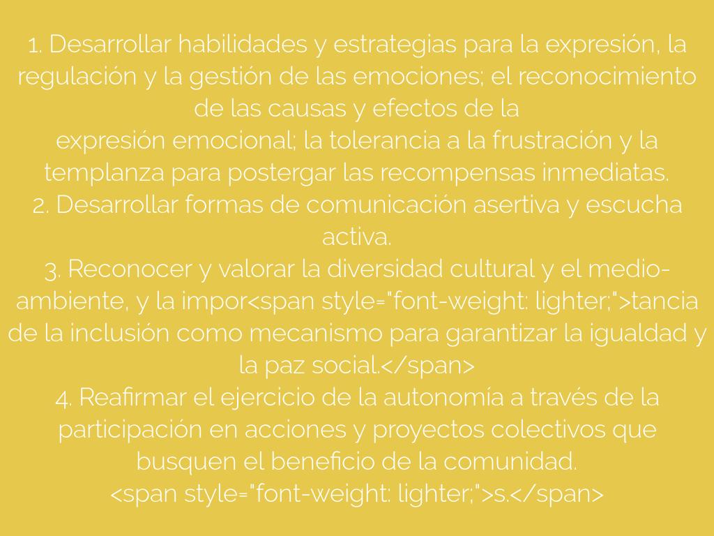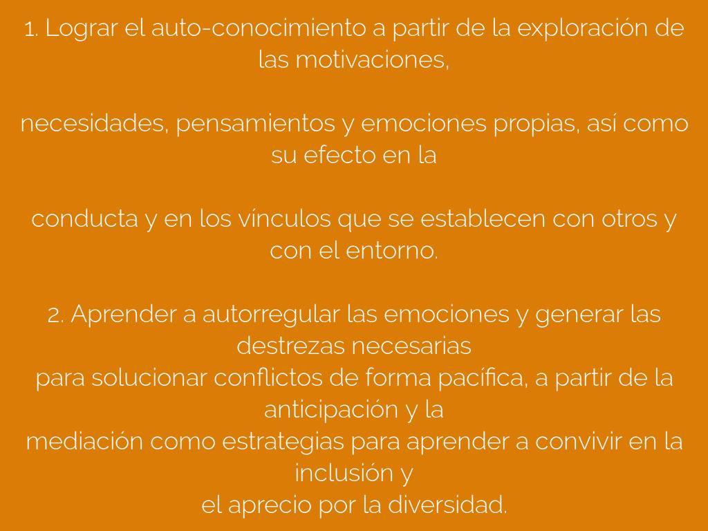 1. Desarrollar habilidades y estrategias para la expresión, la regulación y la gestión de las emociones; el reconocimiento de las causas y efectos de la