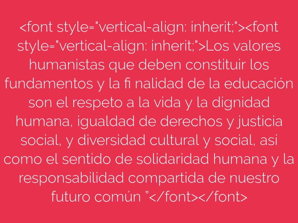 Los valores humanistas que deben constituir los fundamentos y la fi nalidad de la educación son el respeto a la vida y la dignidad humana, igualdad de derechos y justicia social, y diversidad cultural y social, así como el sentido de solidaridad humana y la responsabilidad compartida de nuestro futuro común ”