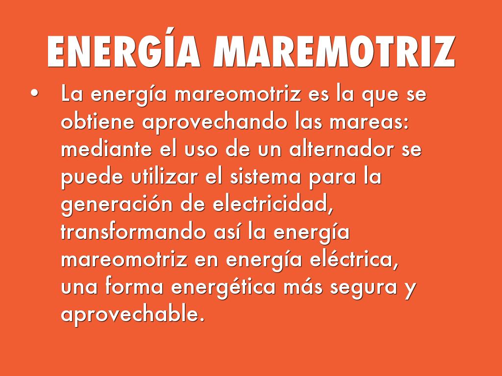 La energía mareomotriz es la que se obtiene aprovechando las mareas: mediante el uso de un alternador se puede utilizar el sistema para la generación de electricidad, transformando así la energía mareomotriz en energía eléctrica, una forma energética más segura y aprovechable.