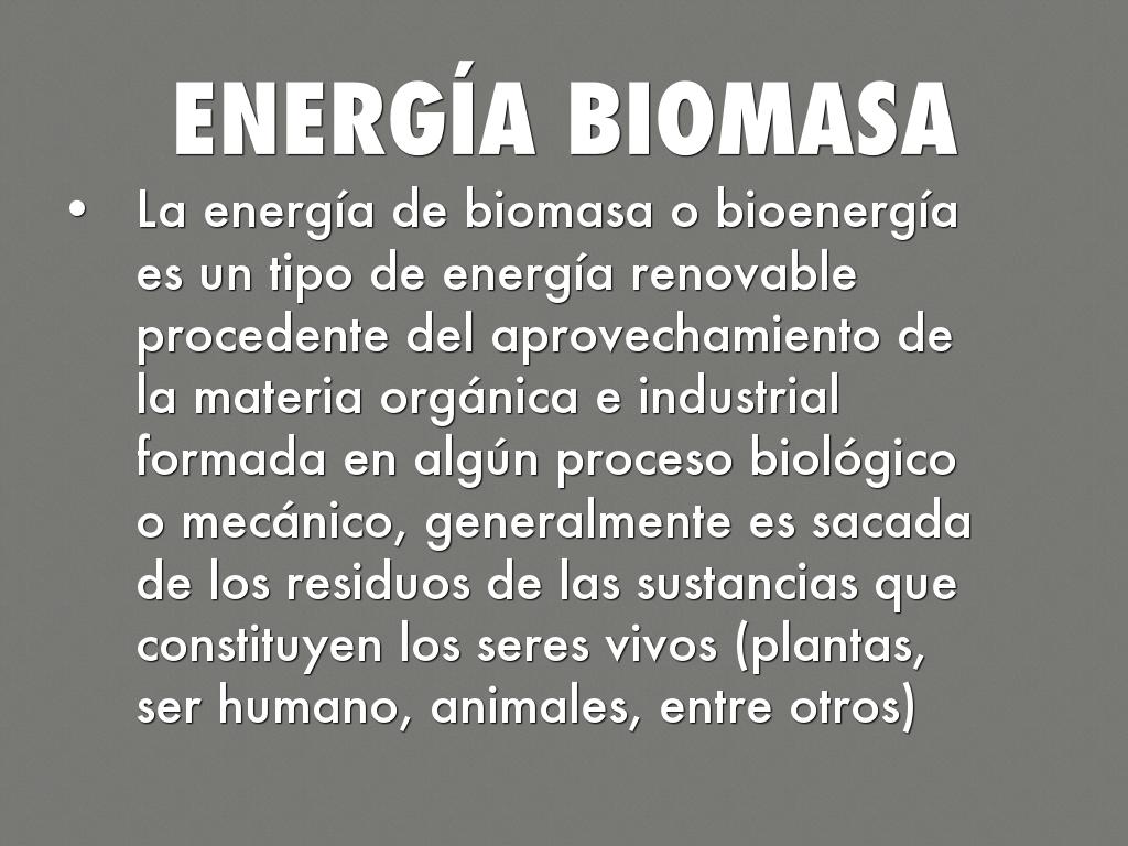 La energía de biomasa o bioenergía es un tipo de energía renovable procedente del aprovechamiento de la materia orgánica e industrial formada en algún proceso biológico o mecánico, generalmente es sacada de los residuos de las sustancias que constituyen los seres vivos (plantas, ser humano, animales, entre otros)