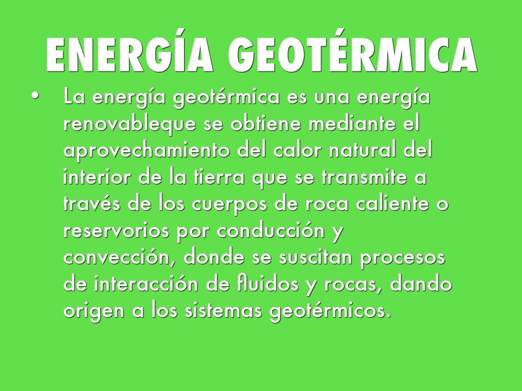La energía geotérmica es una energía renovableque se obtiene mediante el aprovechamiento del calor natural del interior de la tierra que se transmite a través de los cuerpos de roca caliente o reservorios por conducción y convección, donde se suscitan procesos de interacción de fluidos y rocas, dando origen a los sistemas geotérmicos.