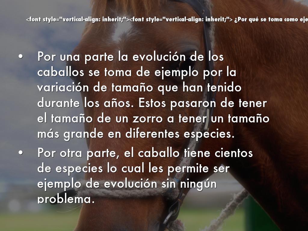Por una parte la evolución de los caballos se toma de ejemplo por la variación de tamaño que han tenido durante los años. Estos pasaron de tener el tamaño de un zorro a tener un tamaño más grande en diferentes especies.