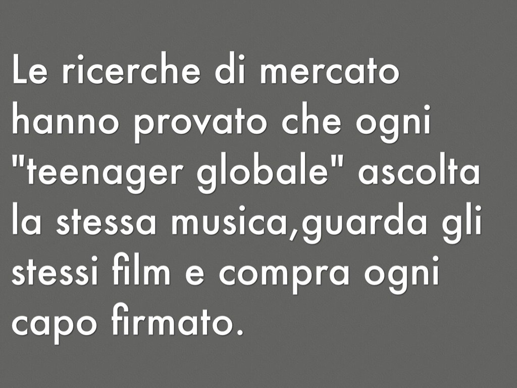 Le ricerche di mercato hanno provato che ogni "teenager globale" ascolta la stessa musica,guarda gli stessi film e compra ogni capo firmato.