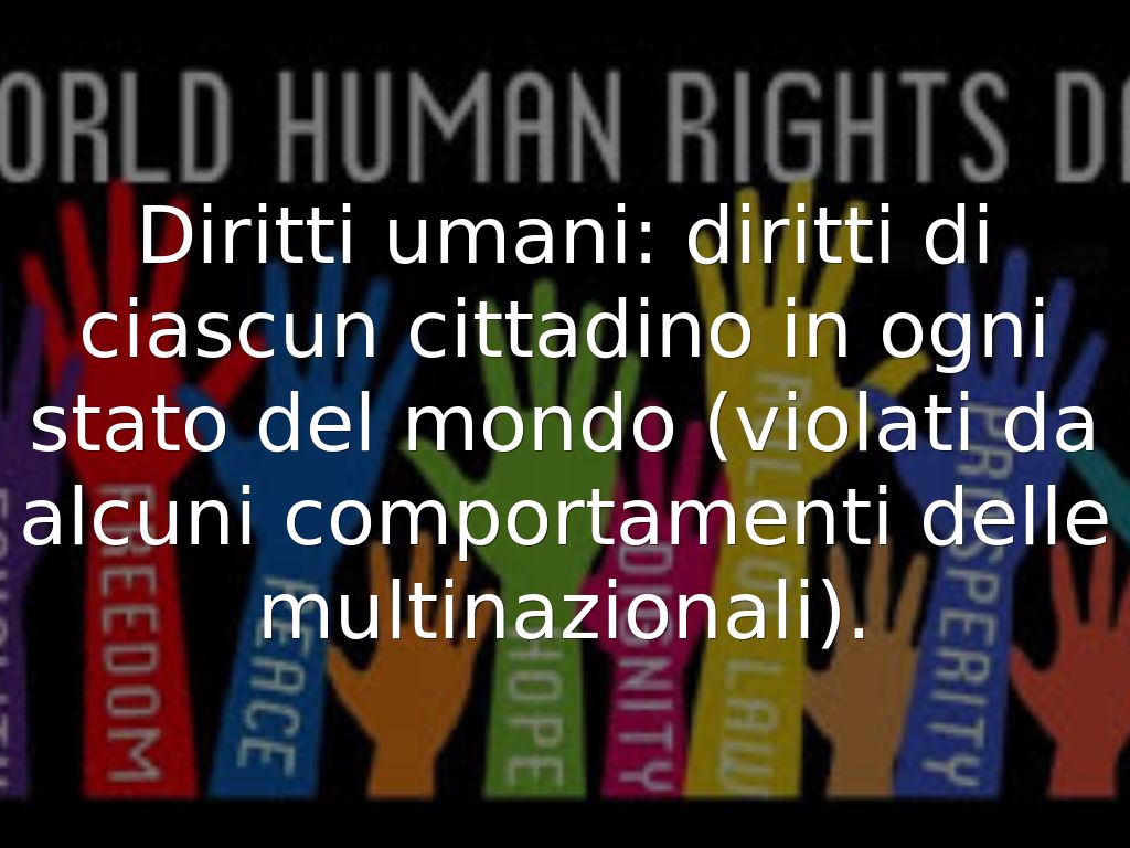 Diritti umani: diritti di ciascun cittadino in ogni stato del mondo (violati da alcuni comportamenti delle multinazionali).