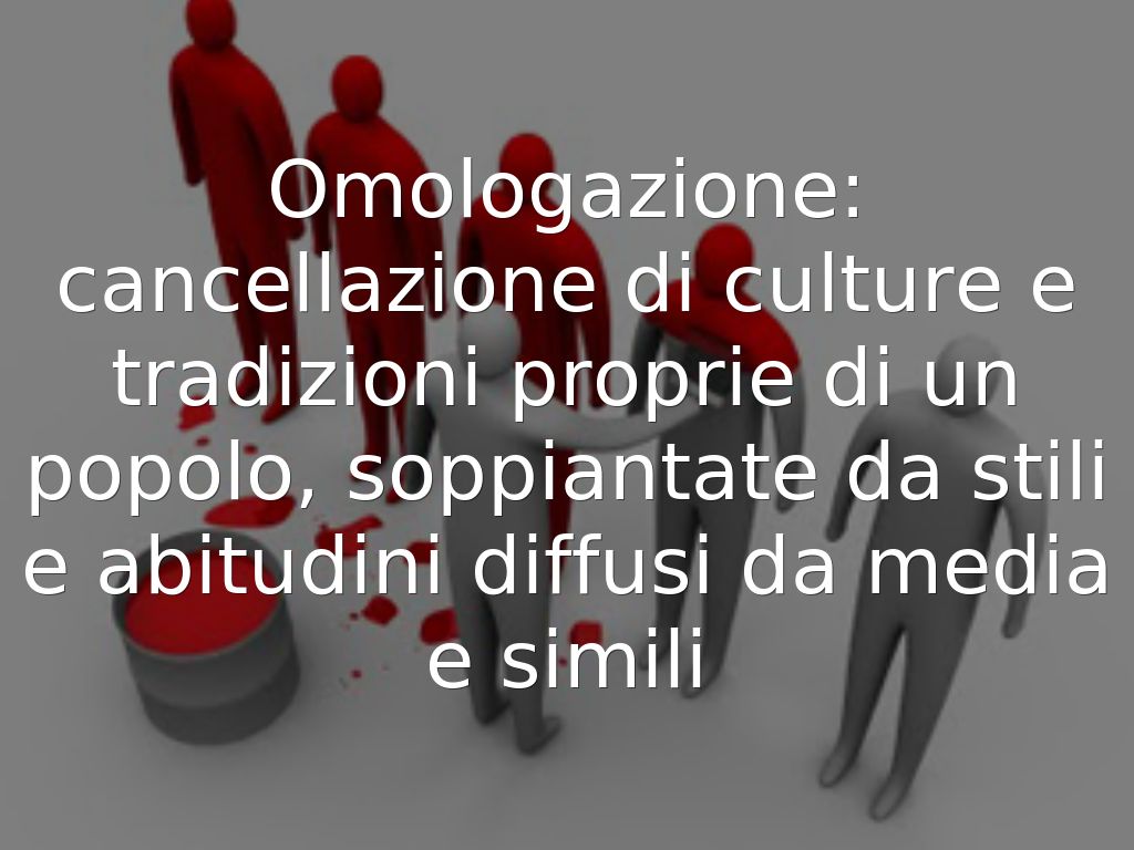 Omologazione: cancellazione di culture e tradizioni proprie di un popolo, soppiantate da stili e abitudini diffusi da media e simili