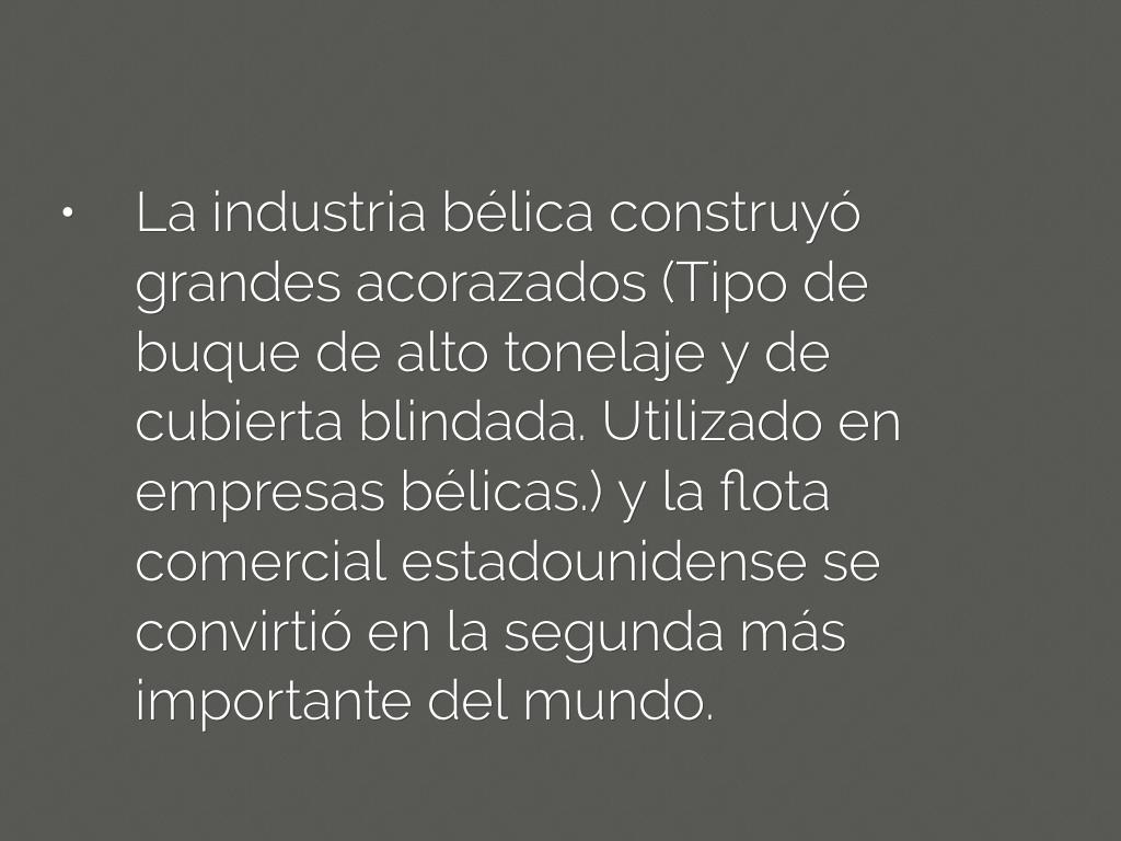 La industria bélica construyó grandes acorazados (Tipo de buque de alto tonelaje y de cubierta blindada. Utilizado en empresas bélicas.) y la flota comercial estadounidense se convirtió en la segunda más importante del mundo.