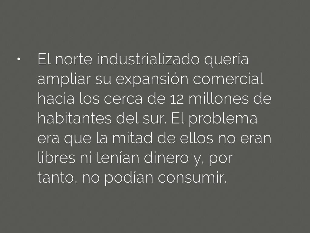 El norte industrializado quería ampliar su expansión comercial hacia los cerca de 12 millones de habitantes del sur. El problema era que la mitad de ellos no eran libres ni tenían dinero y, por tanto, no podían consumir.