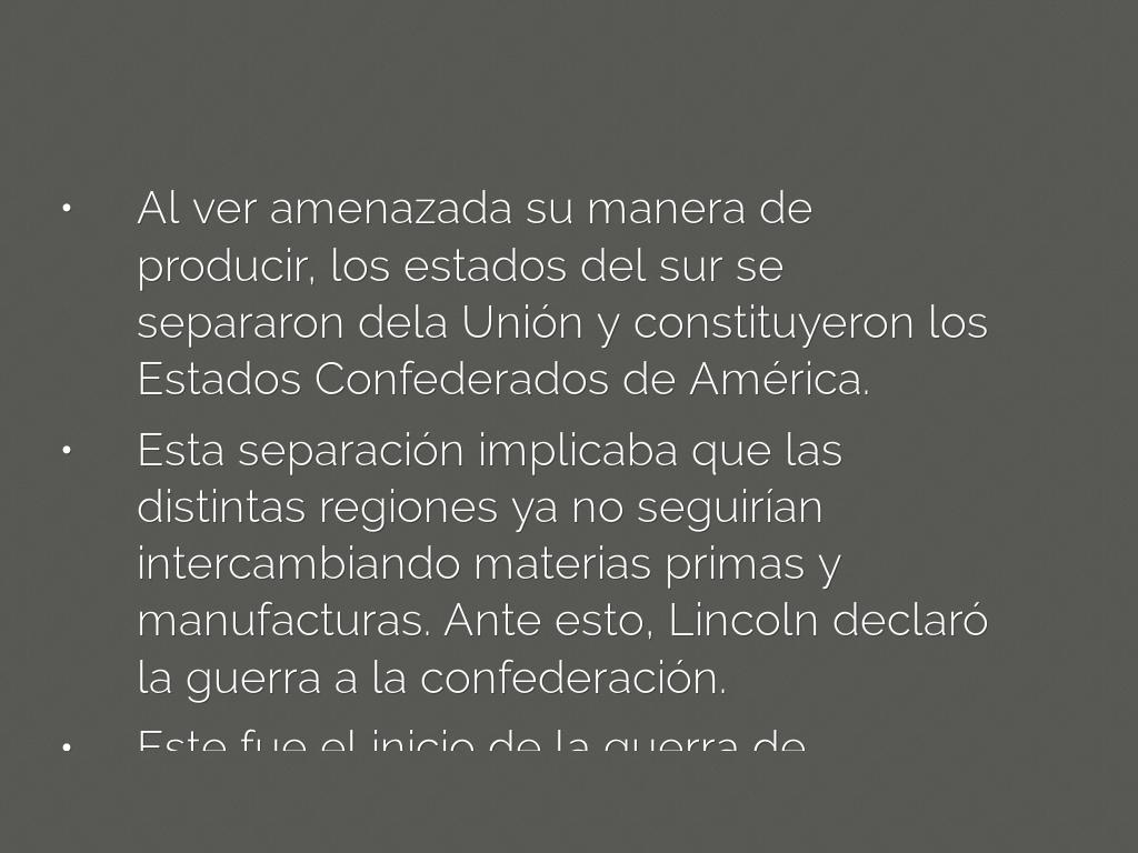 Al ver amenazada su manera de producir, los estados del sur se separaron dela Unión y constituyeron los Estados Confederados de América.