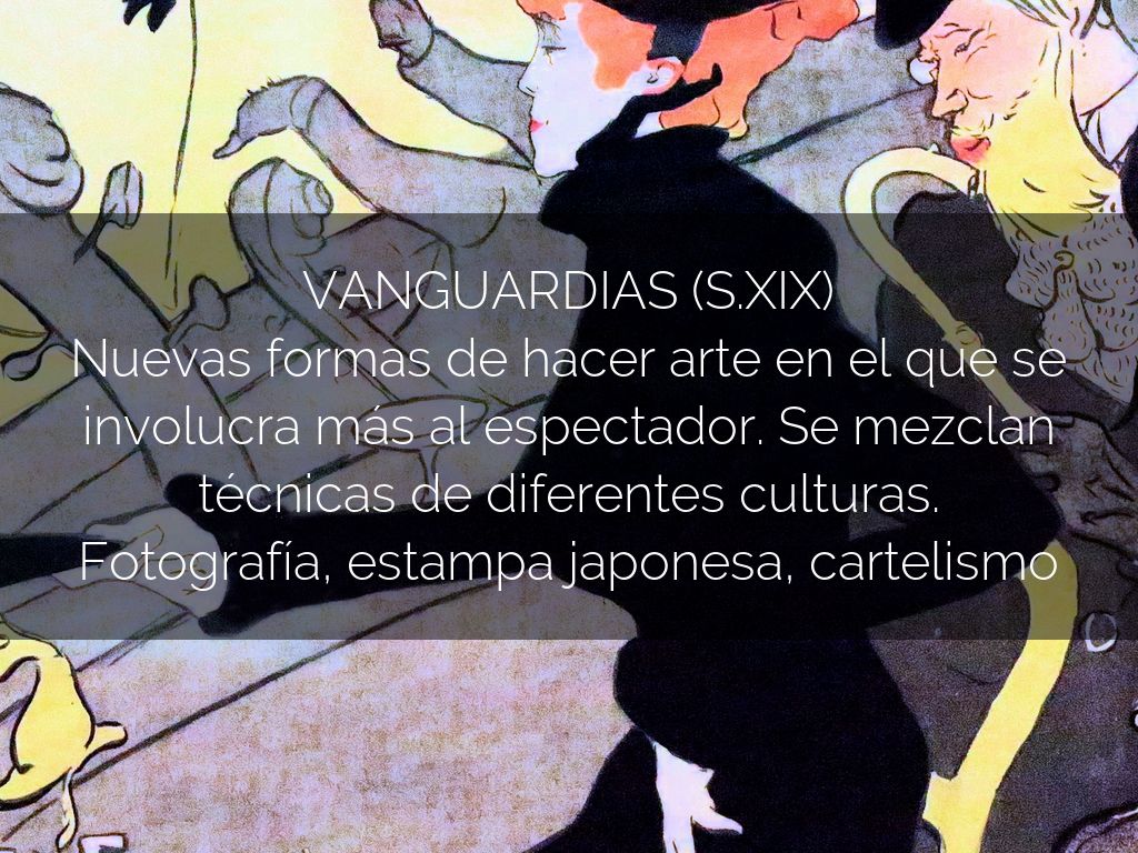 VANGUARDIAS (S.XIX) Nuevas formas de hacer arte en el que se involucra más al espectador. Se mezclan técnicas de diferentes culturas. Fotografía, estampa japonesa, cartelismo