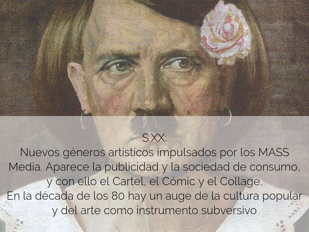 S.XX: Nuevos géneros artísticos impulsados por los MASS Media. Aparece la publicidad y la sociedad de consumo, y con ello el Cartel, el Cómic y el Collage. En la década de los 80 hay un auge de la cultura popular y del arte como instrumento subversivo