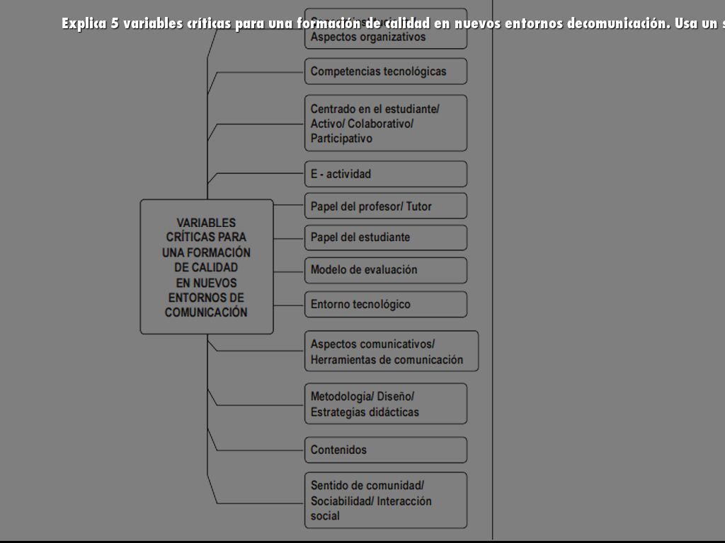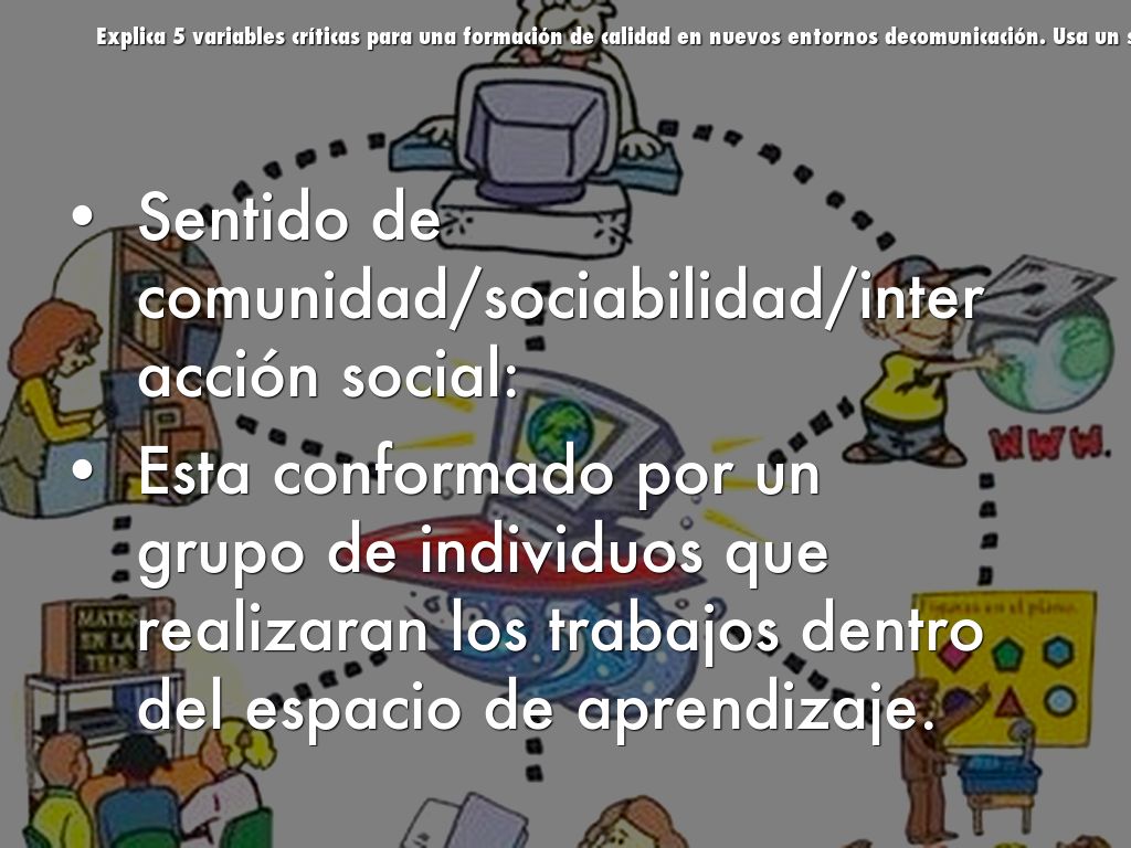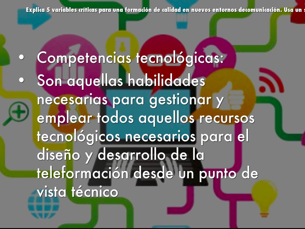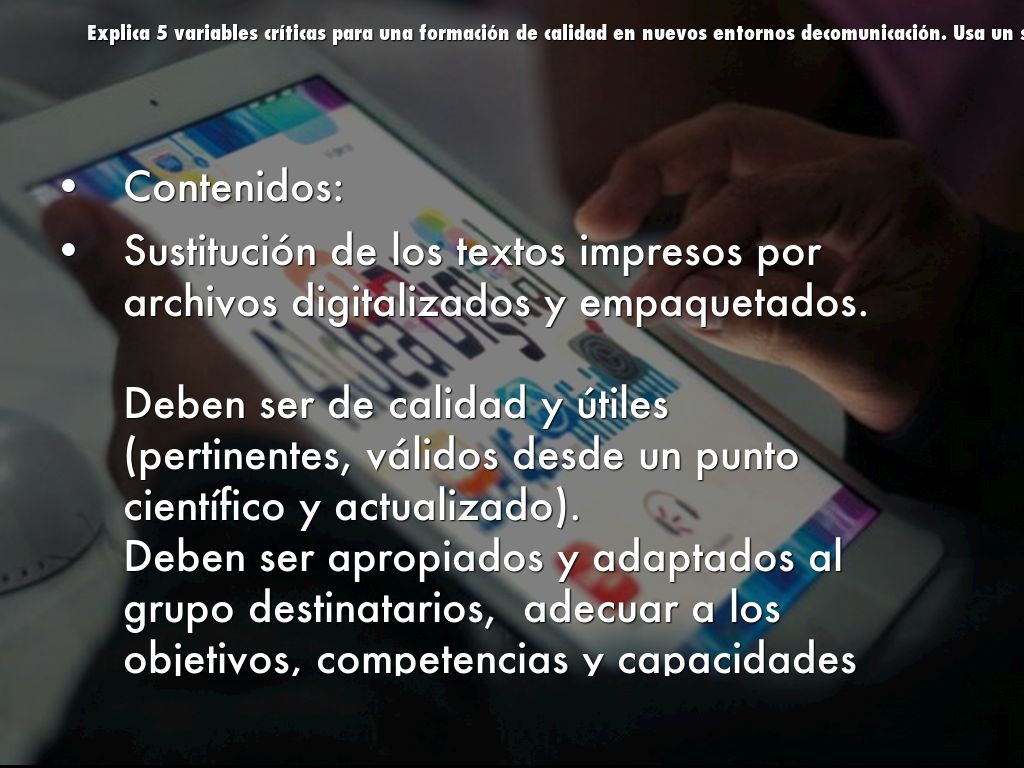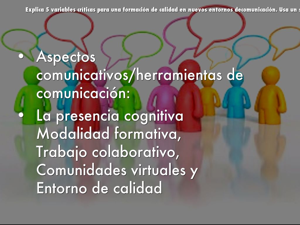 Explica 5 variables críticas para una formación de calidad en nuevos entornos decomunicación. Usa un slide para cada variable