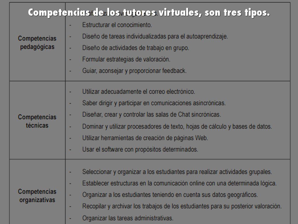 Competencias de los tutores virtuales, son tres tipos.