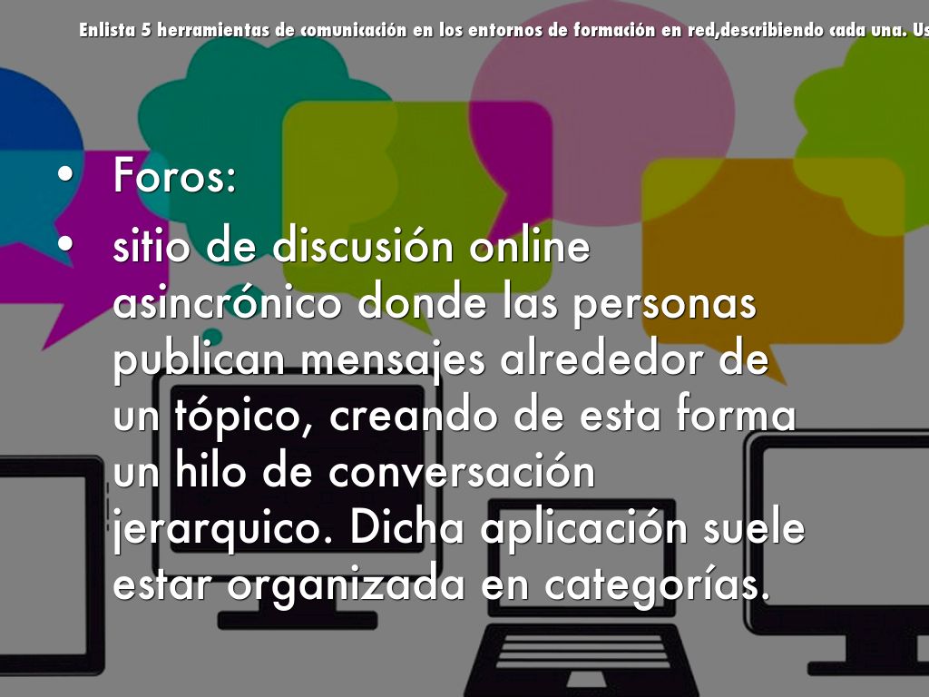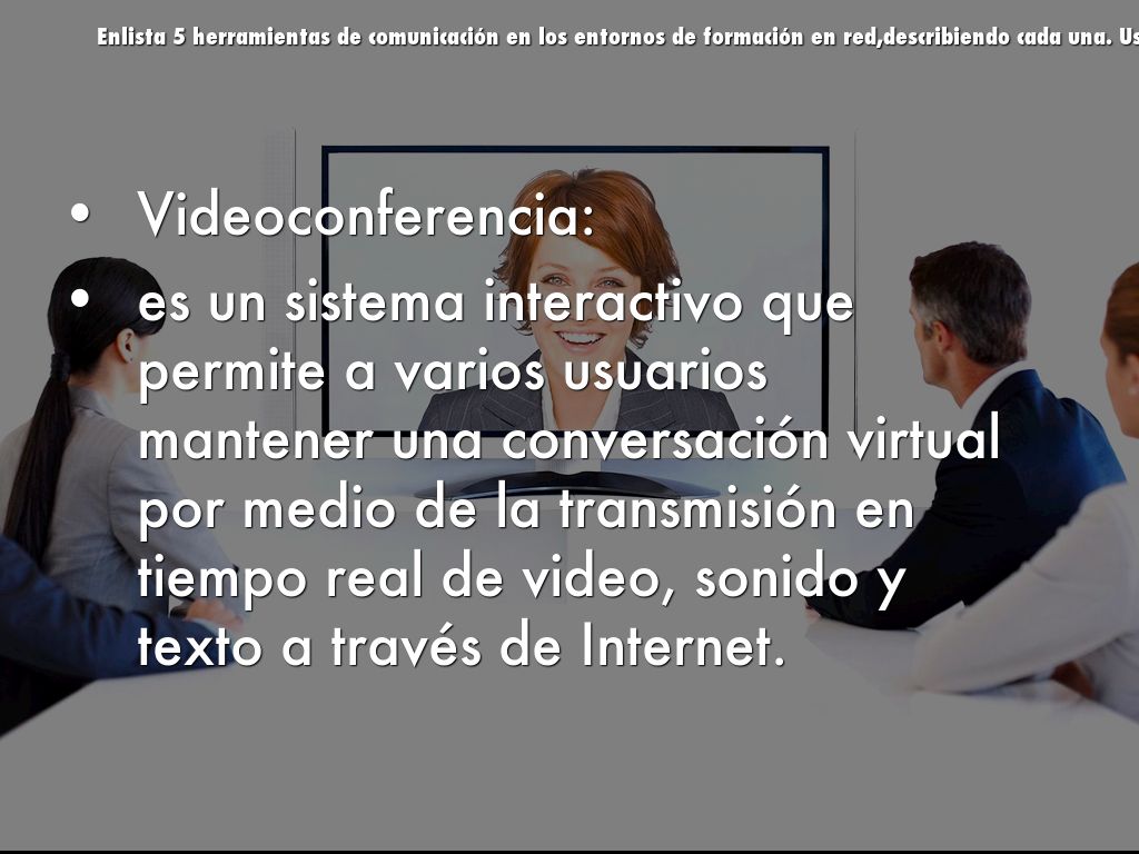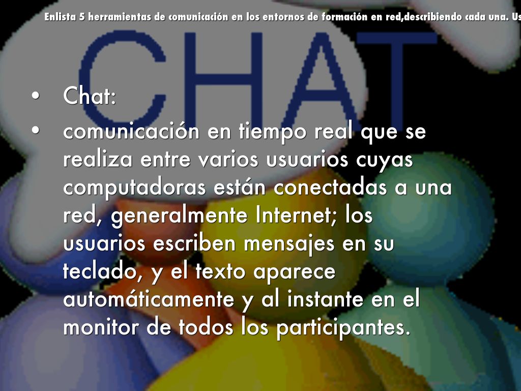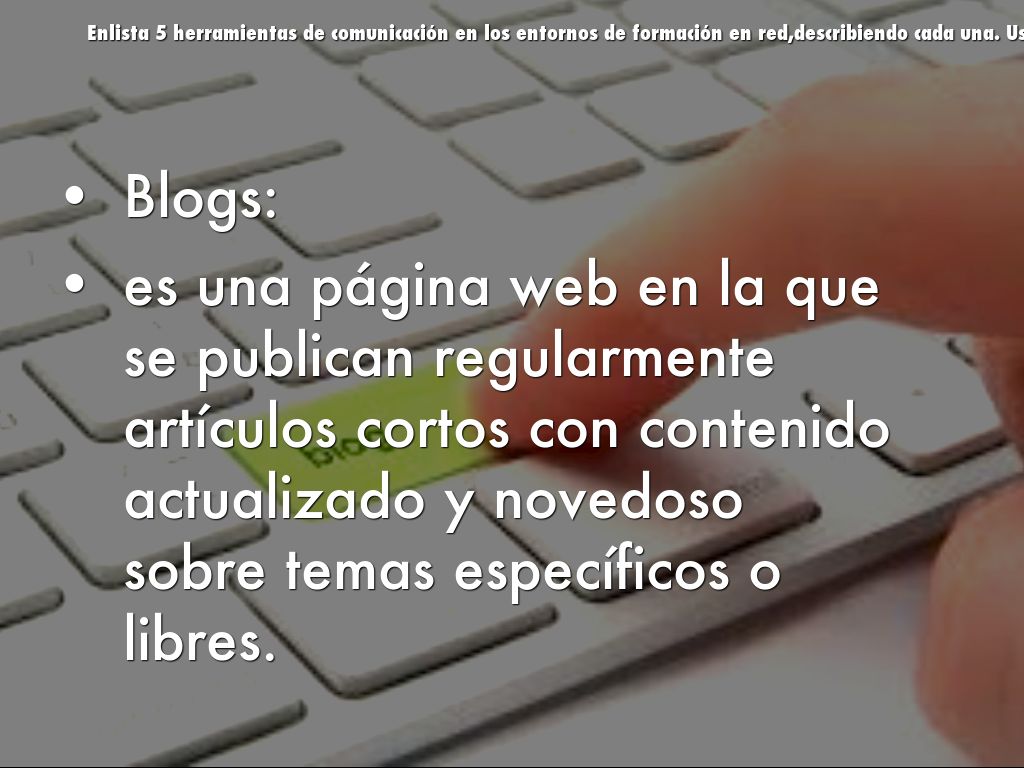 Enlista 5 herramientas de comunicación en los entornos de formación en red,describiendo cada una. Usa un slide para cada herramienta.