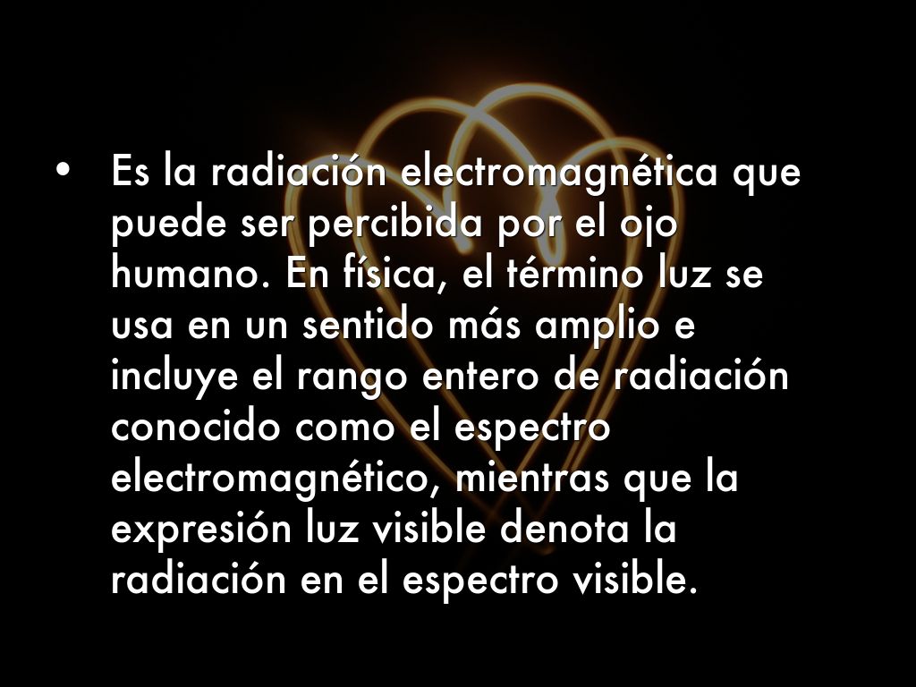 Es la radiación electromagnética que puede ser percibida por el ojo humano. En física, el término luz se usa en un sentido más amplio e incluye el rango entero de radiación conocido como el espectro electromagnético, mientras que la expresión luz visible denota la radiación en el espectro visible.