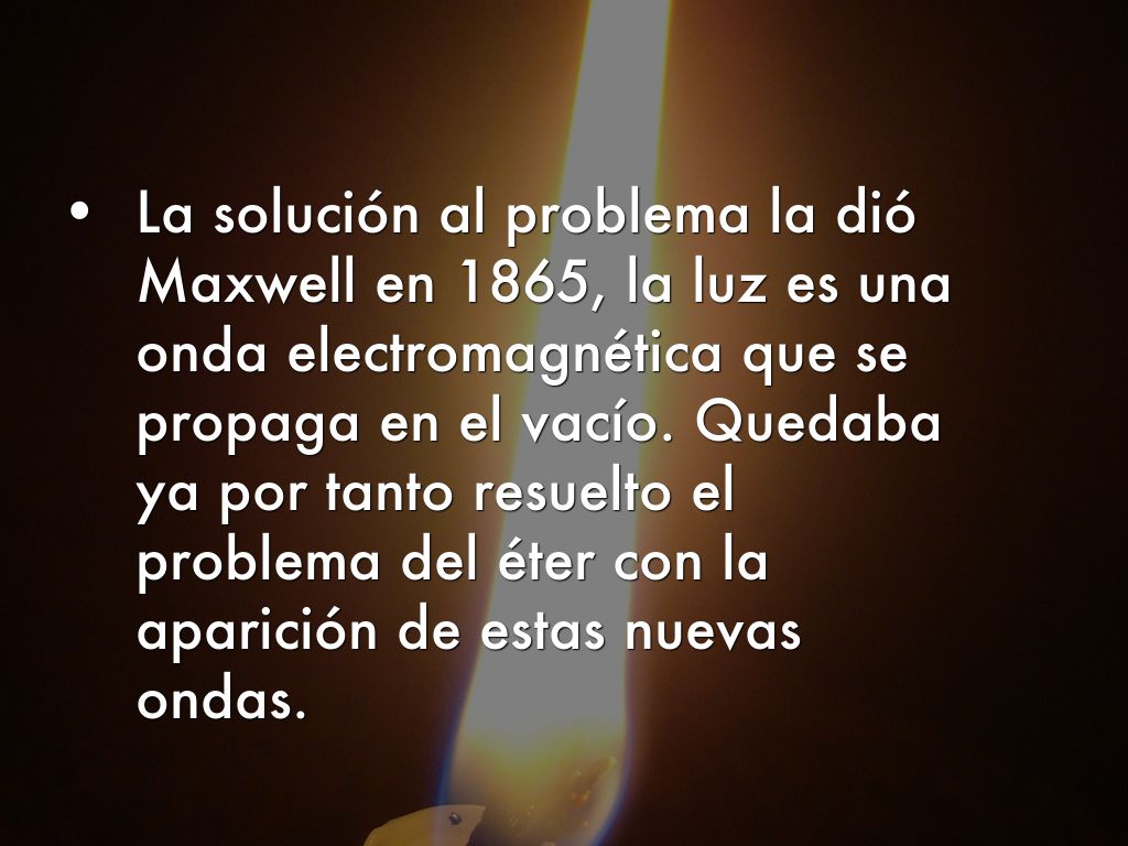 La solución al problema la dió Maxwell en 1865, la luz es una onda electromagnética que se propaga en el vacío. Quedaba ya por tanto resuelto el problema del éter con la aparición de estas nuevas ondas.
