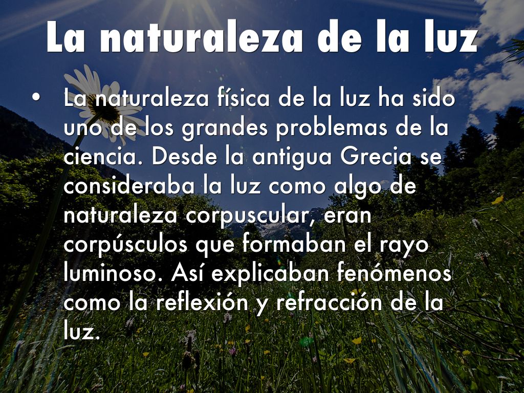 La naturaleza física de la luz ha sido uno de los grandes problemas de la ciencia. Desde la antigua Grecia se consideraba la luz como algo de naturaleza corpuscular, eran corpúsculos que formaban el rayo luminoso. Así explicaban fenómenos como la reflexión y refracción de la luz.