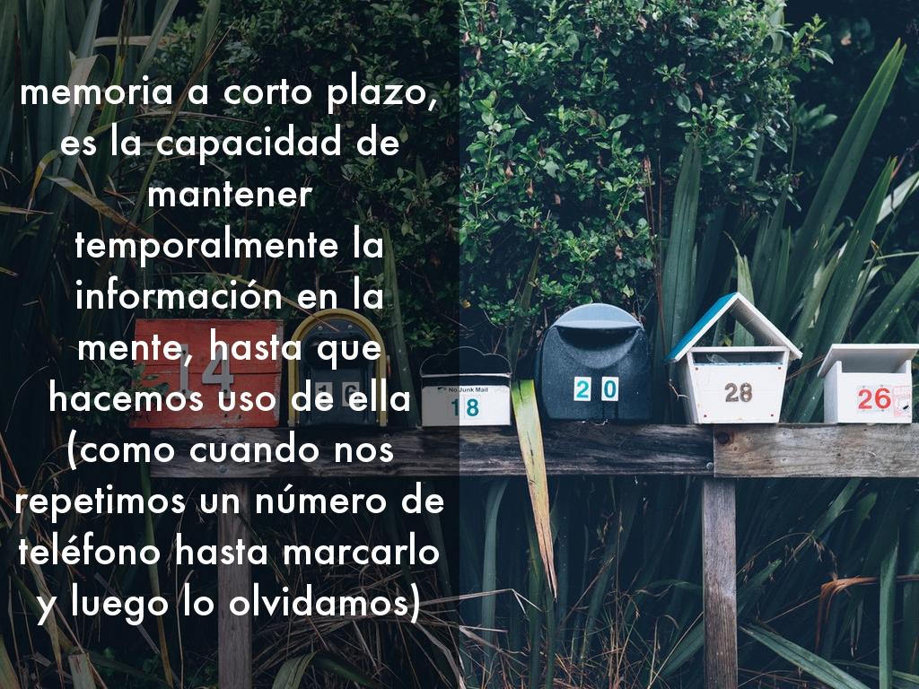 memoria a corto plazo, es la capacidad de mantener temporalmente la información en la mente, hasta que hacemos uso de ella (como cuando nos repetimos un número de teléfono hasta marcarlo y luego lo olvidamos)
