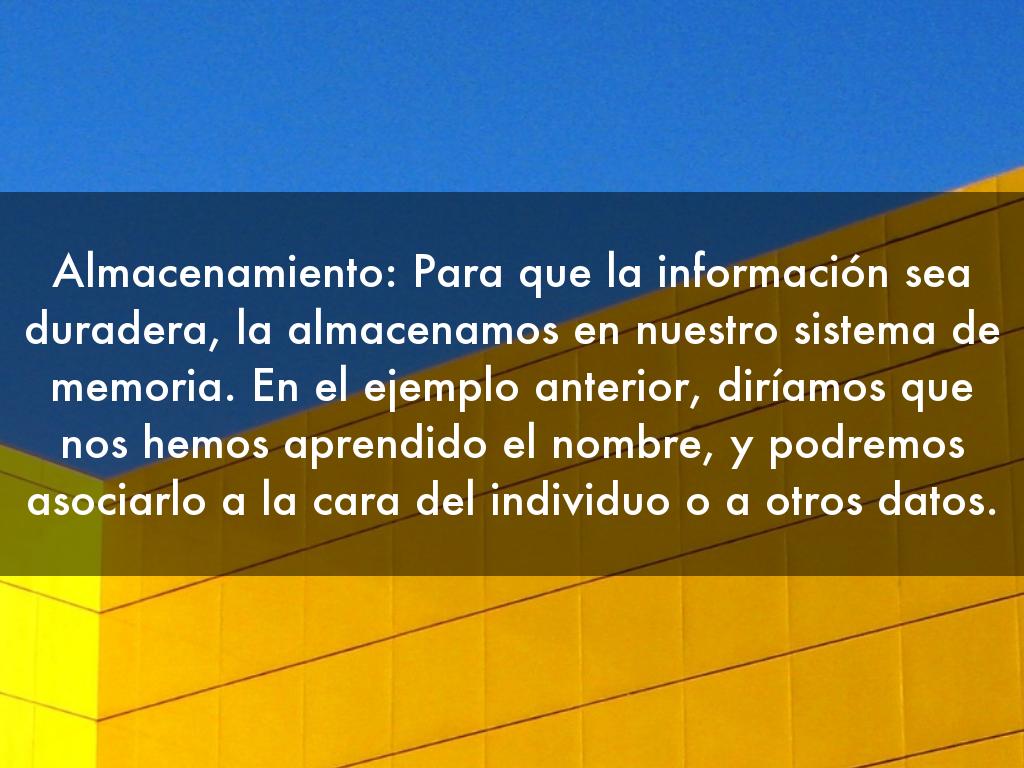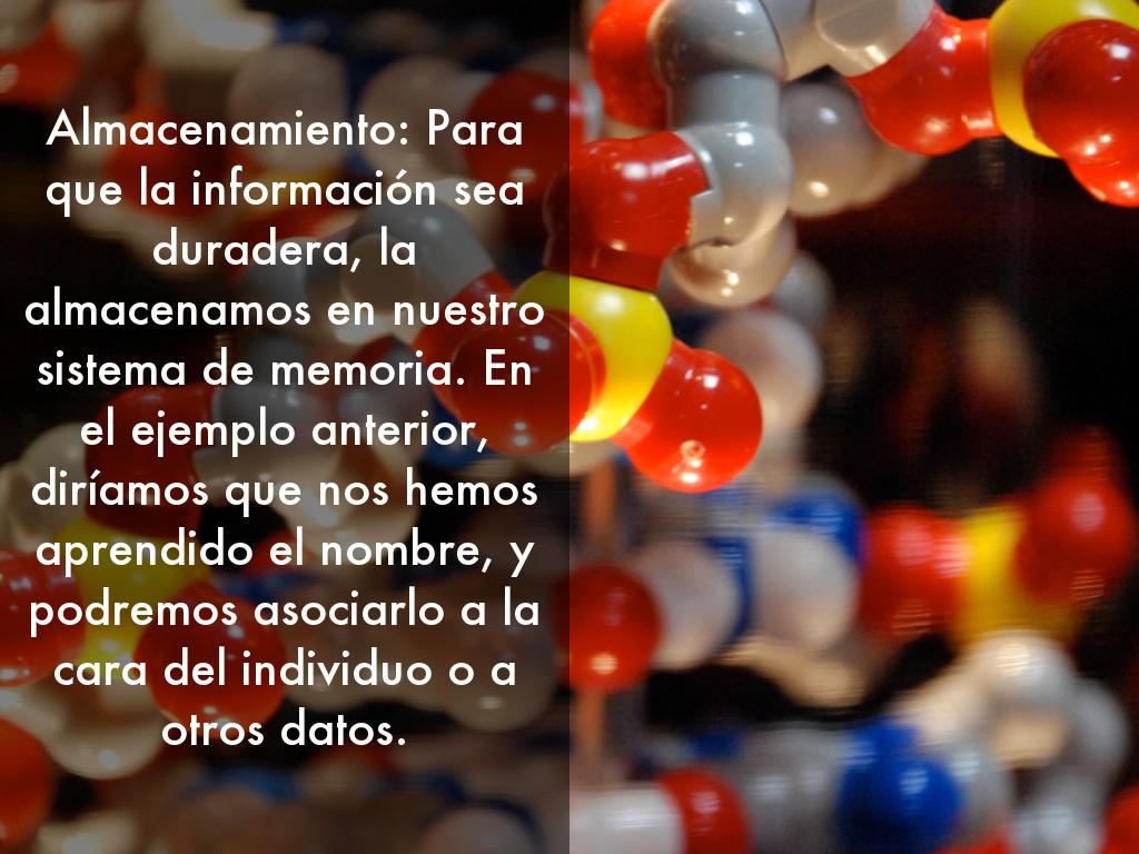 Almacenamiento: Para que la información sea duradera, la almacenamos en nuestro sistema de memoria. En el ejemplo anterior, diríamos que nos hemos aprendido el nombre, y podremos asociarlo a la cara del individuo o a otros datos.