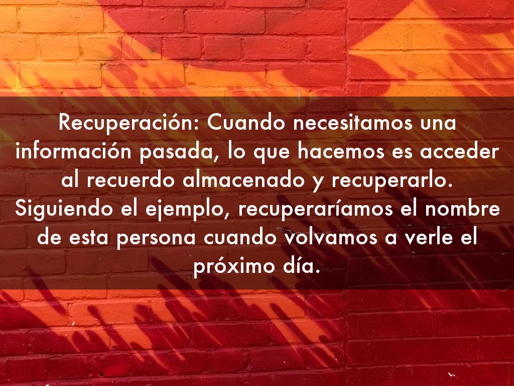 Recuperación: Cuando necesitamos una información pasada, lo que hacemos es acceder al recuerdo almacenado y recuperarlo. Siguiendo el ejemplo, recuperaríamos el nombre de esta persona cuando volvamos a verle el próximo día.