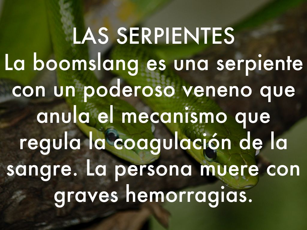 La boomslang es una serpiente con un poderoso veneno que anula el mecanismo que regula la coagulación de la sangre. La persona muere con graves hemorragias.