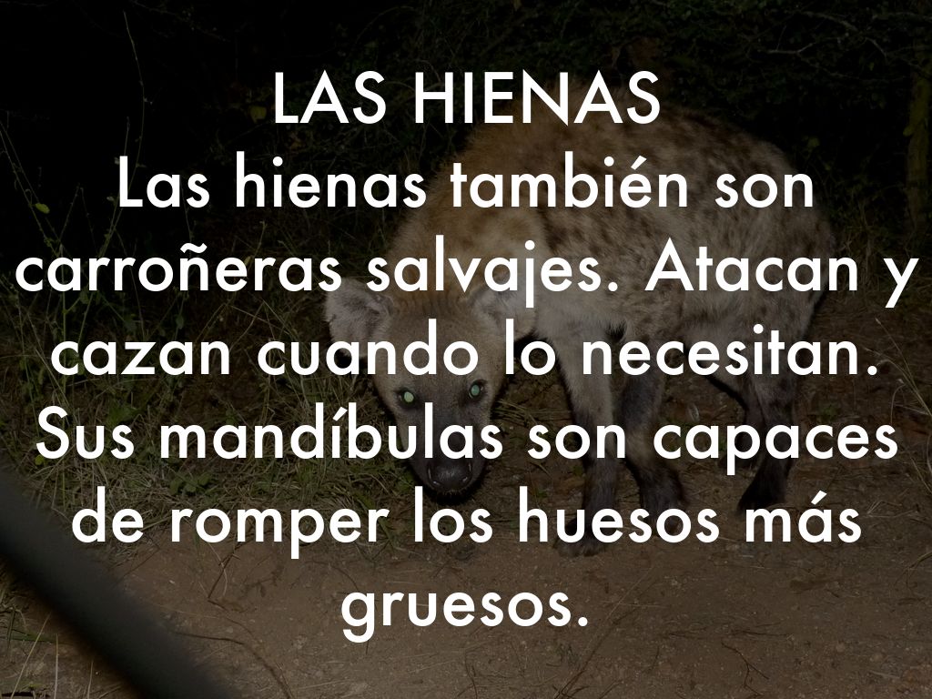 Las hienas también son carroñeras salvajes. Atacan y cazan cuando lo necesitan. Sus mandíbulas son capaces de romper los huesos más gruesos.