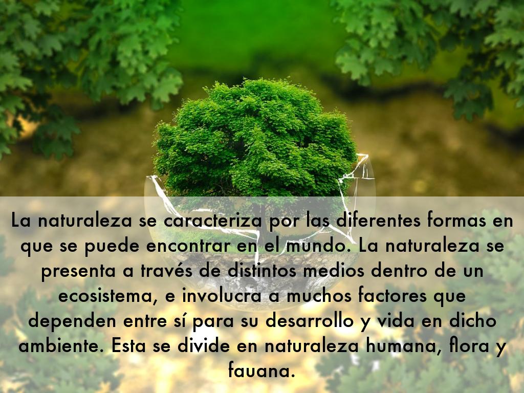 La naturaleza se caracteriza por las diferentes formas en que se puede encontrar en el mundo. La naturaleza se presenta a través de distintos medios dentro de un ecosistema, e involucra a muchos factores que dependen entre sí para su desarrollo y vida en dicho ambiente. Esta se divide en naturaleza humana, flora y fauana.