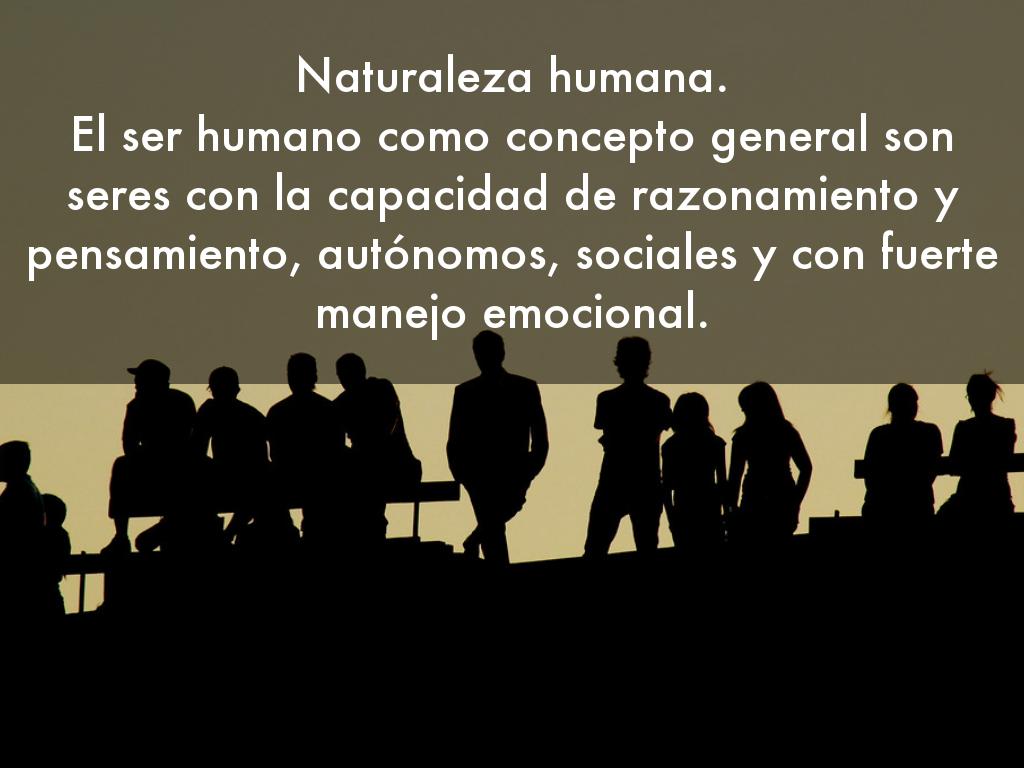 Naturaleza humana. El ser humano como concepto general son seres con la capacidad de razonamiento y pensamiento, autónomos, sociales y con fuerte manejo emocional.
