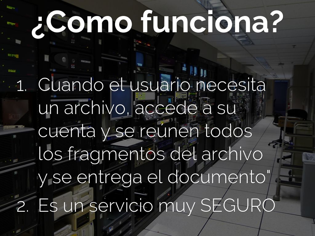 Cuando el usuario necesita un archivo, accede a su cuenta y se reúnen todos los fragmentos del archivo y se entrega el documento"