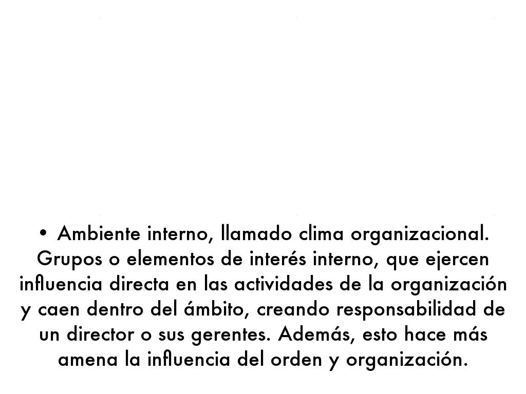 • Ambiente interno, llamado clima organizacional. Grupos o elementos de interés interno, que ejercen influencia directa en las actividades de la organización y caen dentro del ámbito, creando responsabilidad de un director o sus gerentes. Además, esto hace más amena la influencia del orden y organización.