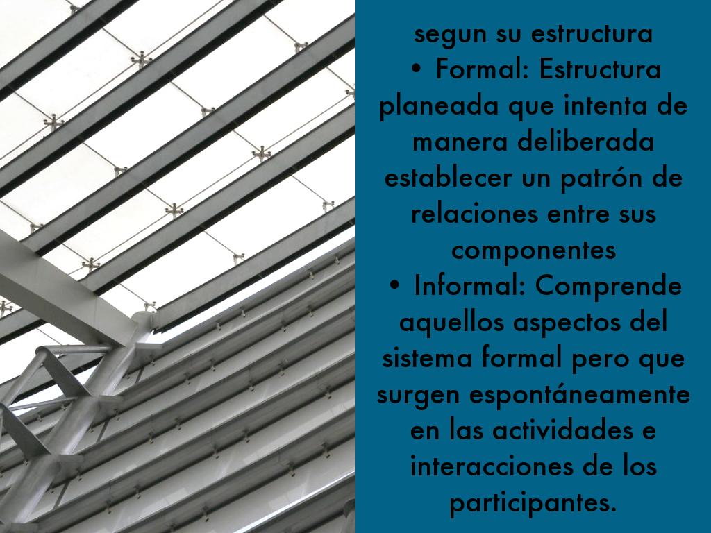 • Formal: Estructura planeada que intenta de manera deliberada establecer un patrón de relaciones entre sus componentes