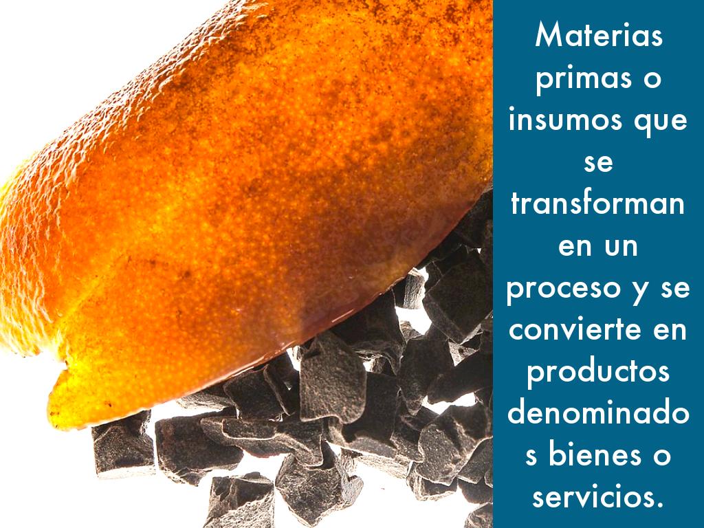 Materias primas o insumos que se transforman en un proceso y se convierte en productos denominados bienes o servicios.