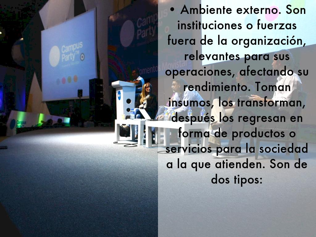 • Ambiente externo. Son instituciones o fuerzas fuera de la organización, relevantes para sus operaciones, afectando su rendimiento. Toman insumos, los transforman, después los regresan en forma de productos o servicios para la sociedad a la que atienden. Son de dos tipos: