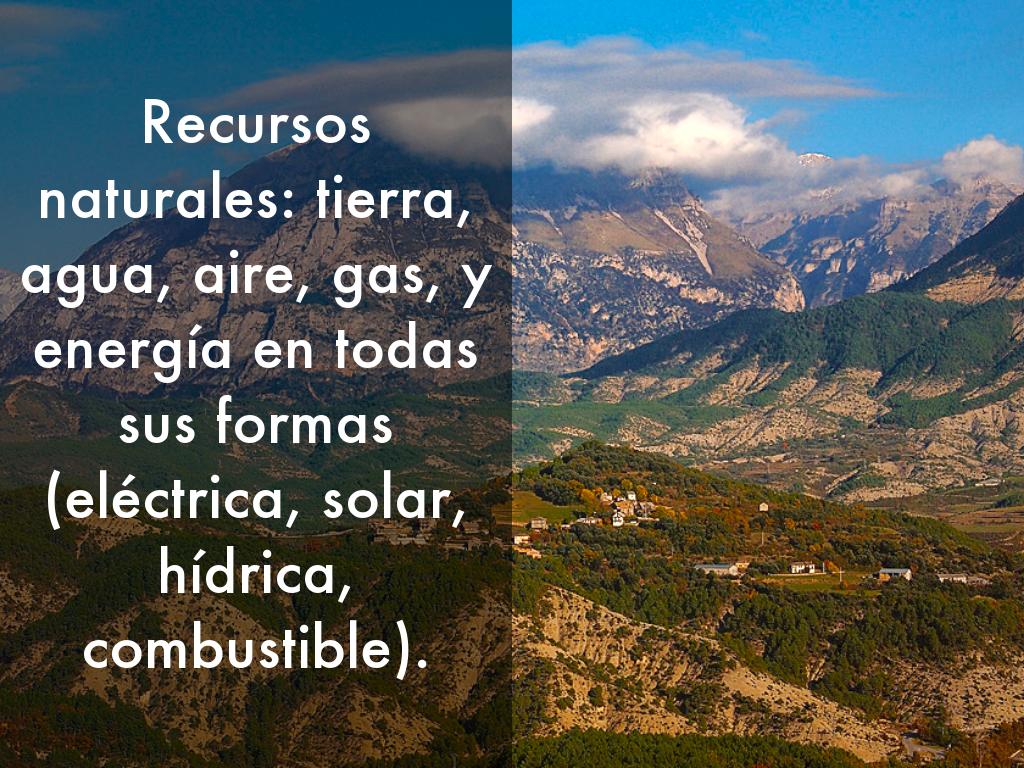 Recursos naturales: tierra, agua, aire, gas, y energía en todas sus formas (eléctrica, solar, hídrica, combustible).