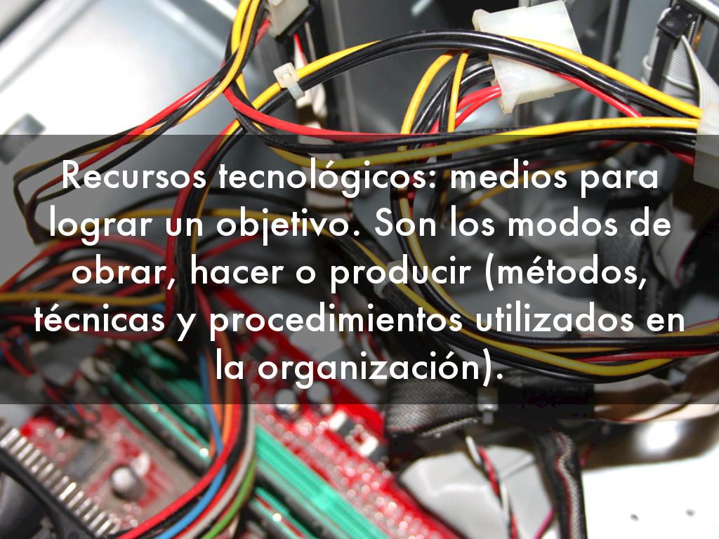 Recursos tecnológicos: medios para lograr un objetivo. Son los modos de obrar, hacer o producir (métodos, técnicas y procedimientos utilizados en la organización).