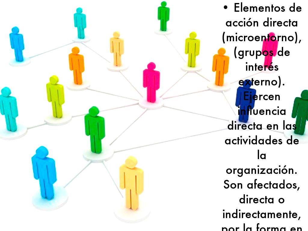 • Elementos de acción directa (microentorno), (grupos de interés externo). Ejercen influencia directa en las actividades de la organización. Son afectados, directa o indirectamente, por la forma en que la organización busca lograr sus objetivos.