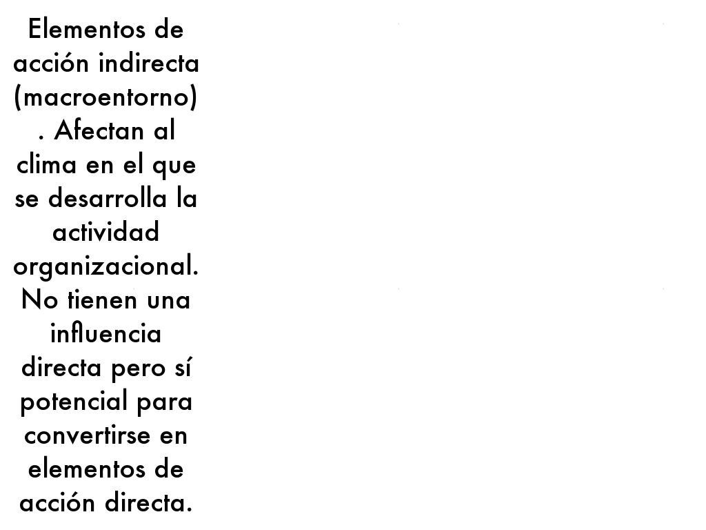Elementos de acción indirecta (macroentorno). Afectan al clima en el que se desarrolla la actividad organizacional. No tienen una influencia directa pero sí potencial para convertirse en elementos de acción directa.