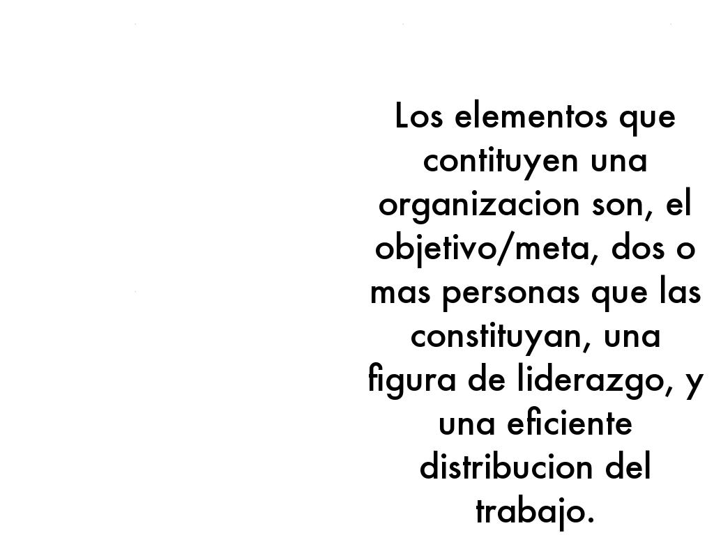 Los elementos que contituyen una organizacion son, el objetivo/meta, dos o mas personas que las constituyan, una figura de liderazgo, y una eficiente distribucion del trabajo.