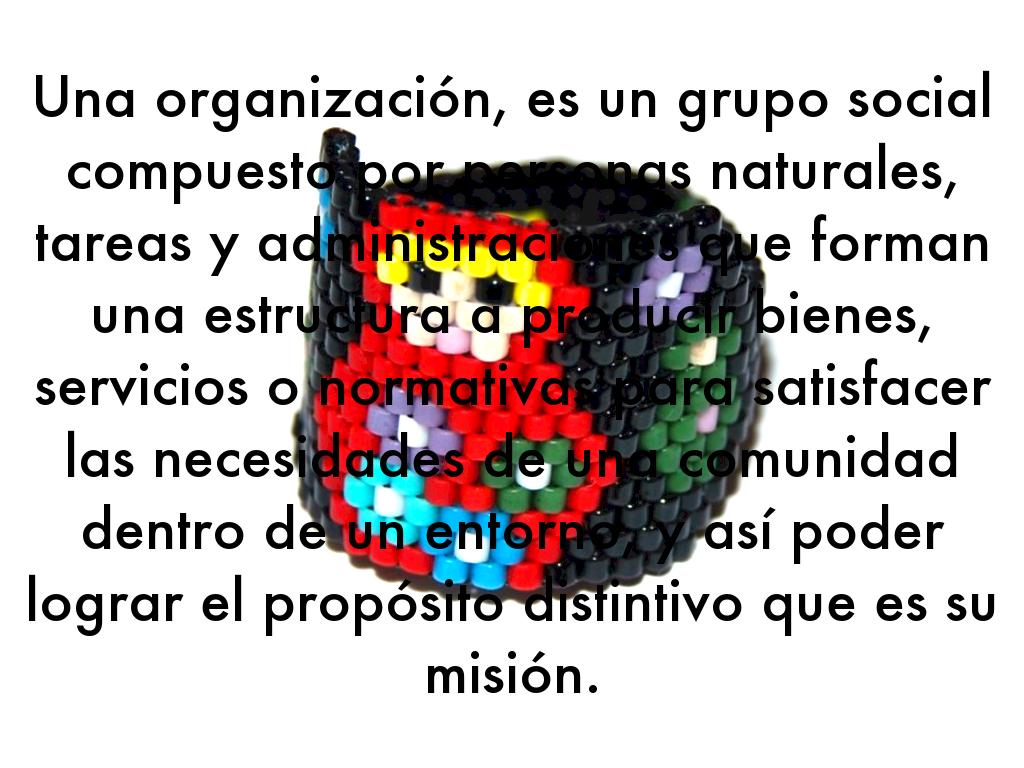 Una organización, es un grupo social compuesto por personas naturales, tareas y administraciones que forman una estructura a producir bienes, servicios o normativas para satisfacer las necesidades de una comunidad dentro de un entorno, y así poder lograr el propósito distintivo que es su misión.