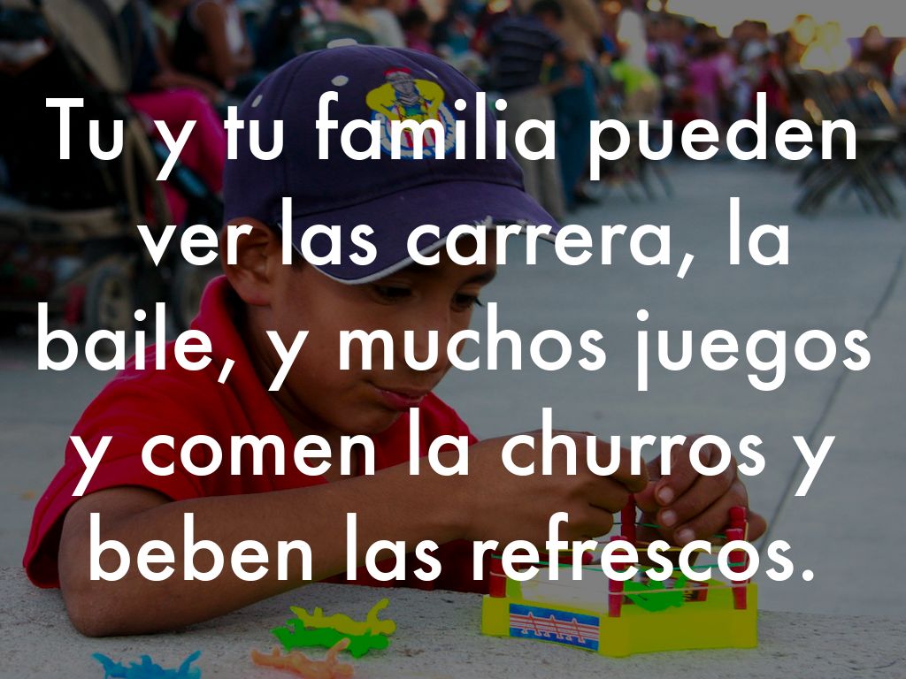 Tu y tu familia pueden ver las carrera, la baile, y muchos juegos y comen la churros y beben las refrescos.