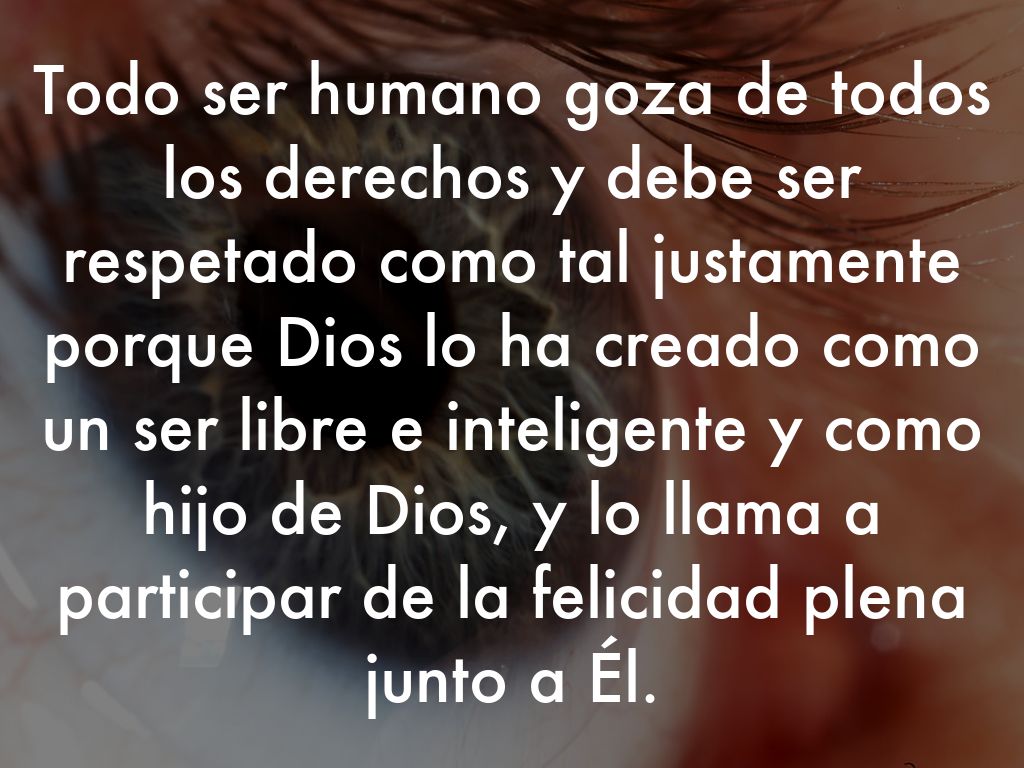 Todo ser humano goza de todos los derechos y debe ser respetado como tal justamente porque Dios lo ha creado como un ser libre e inteligente y como hijo de Dios, y lo llama a participar de la felicidad plena junto a Él.