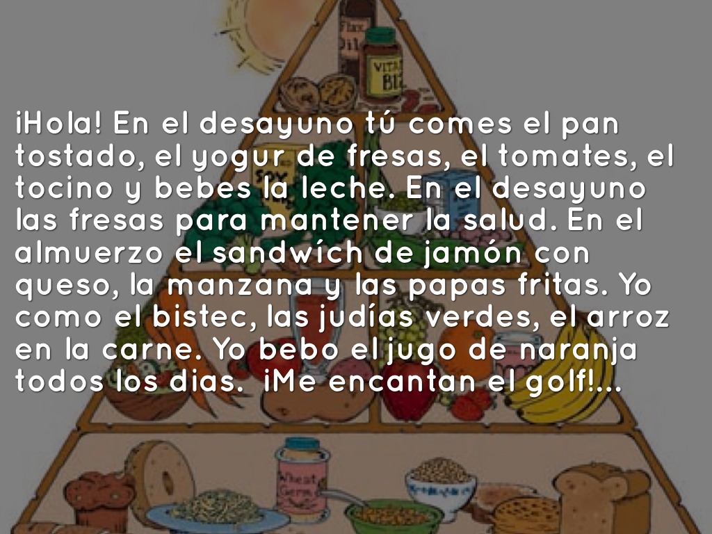 ¡Hola! En el desayuno tú comes el pan tostado, el yogur de fresas, el tomates, el tocino y bebes la leche. En el desayuno las fresas para mantener la salud. En el almuerzo el sandwích de jamón con queso, la manzana y las papas fritas. Yo como el bistec, las judías verdes, el arroz en la carne. Yo bebo el jugo de naranja todos los dias. ¡Me encantan el golf!